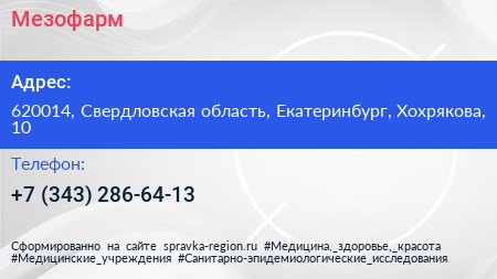 Мезофарм по адресу 620014, Свердловская область, Екатеринбург, Хохрякова, 10 в дальнейшем Организация, размещена в следующих категориях: