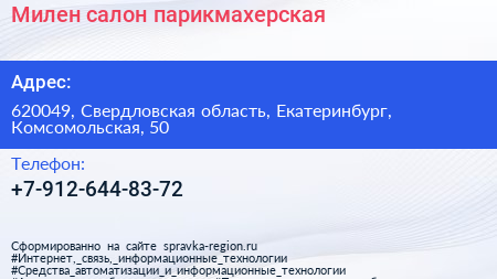 Милен, салон-парикмахерская по адресу 620049, Свердловская область, Екатеринбург, Комсомольская, 50 в дальнейшем Организация, размещена в следующих категориях: