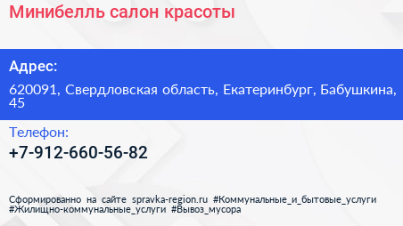 Минибелль, салон красоты по адресу 620091, Свердловская область, Екатеринбург, Бабушкина, 45 в дальнейшем Организация, размещена в следующих категориях: