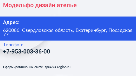 Модельфо, дизайн-ателье по адресу 620086, Свердловская область, Екатеринбург, Посадская, 77 в дальнейшем Организация, размещена в следующих категориях: