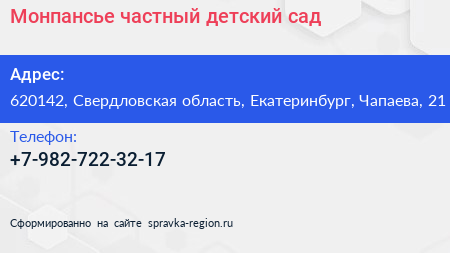 Монпансье, частный детский сад по адресу 620142, Свердловская область, Екатеринбург, Чапаева, 21 в дальнейшем Организация, размещена в следующих категориях: