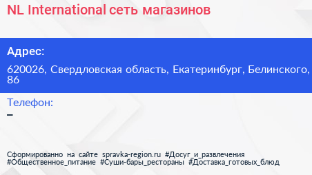 NL International, сеть магазинов по адресу 620026, Свердловская область, Екатеринбург, Белинского, 86 в дальнейшем Организация, размещена в следующих категориях: