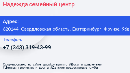 Надежда, семейный центр по адресу 620144, Свердловская область, Екатеринбург, Фрунзе, 96в в дальнейшем Организация, размещена в следующих категориях: