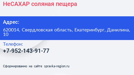 НеСАХАР, соляная пещера по адресу 620014, Свердловская область, Екатеринбург, Данилина, 10 в дальнейшем Организация, размещена в следующих категориях: