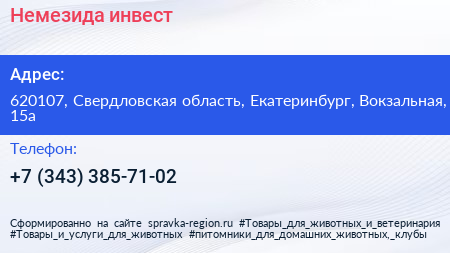 Немезида инвест по адресу 620107, Свердловская область, Екатеринбург, Вокзальная, 15а в дальнейшем Организация, размещена в следующих категориях: