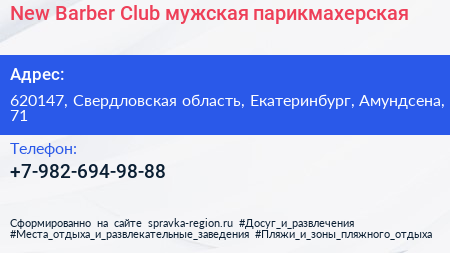 New Barber Club, мужская парикмахерская по адресу 620147, Свердловская область, Екатеринбург, Амундсена, 71 в дальнейшем Организация, размещена в следующих категориях: