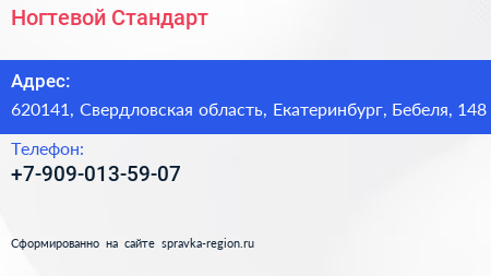 Ногтевой Стандарт по адресу 620141, Свердловская область, Екатеринбург, Бебеля, 148 в дальнейшем Организация, размещена в следующих категориях: