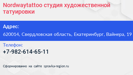 Nordwaytattoo, студия художественной татуировки по адресу 620014, Свердловская область, Екатеринбург, Вайнера, 19 в дальнейшем Организация, размещена в следующих категориях: