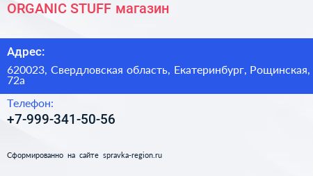 ORGANIC STUFF, магазин по адресу 620023, Свердловская область, Екатеринбург, Рощинская, 72а в дальнейшем Организация, размещена в следующих категориях: