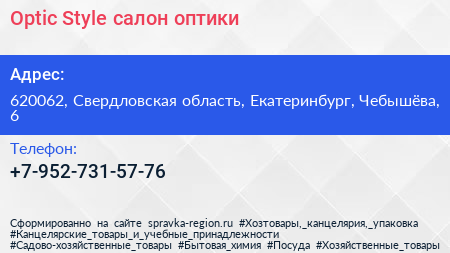 Optic Style, салон оптики по адресу 620062, Свердловская область, Екатеринбург, Чебышёва, 6 в дальнейшем Организация, размещена в следующих категориях: