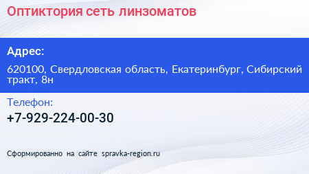 Оптиктория, сеть линзоматов по адресу 620100, Свердловская область, Екатеринбург, Сибирский тракт, 8н в дальнейшем Организация, размещена в следующих категориях: