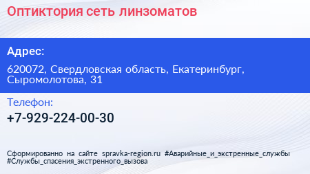 Оптиктория, сеть линзоматов по адресу 620072, Свердловская область, Екатеринбург, Сыромолотова, 31 в дальнейшем Организация, размещена в следующих категориях: