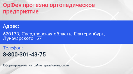 ОрФея, протезно-ортопедическое предприятие по адресу 620133, Свердловская область, Екатеринбург, Луначарского, 57 в дальнейшем Организация, размещена в следующих категориях: