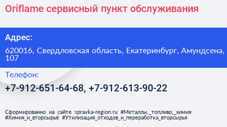 Oriflame, сервисный пункт обслуживания по адресу 620016, Свердловская область, Екатеринбург, Амундсена, 107 в дальнейшем Организация, размещена в следующих категориях: