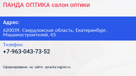 ПАНДА ОПТИКА, салон оптики по адресу 620039, Свердловская область, Екатеринбург, Машиностроителей, 43 в дальнейшем Организация, размещена в следующих категориях: