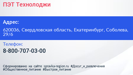 ПЭТ-Технолоджи по адресу 620036, Свердловская область, Екатеринбург, Соболева, 29/6 в дальнейшем Организация, размещена в следующих категориях: