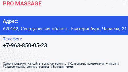 PRO: MASSAGE по адресу 620142, Свердловская область, Екатеринбург, Чапаева, 21 в дальнейшем Организация, размещена в следующих категориях: