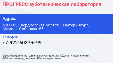 ПРОГРЕСС, зуботехническая лаборатория по адресу 620000, Свердловская область, Екатеринбург, Мамина-Сибиряка, 85 в дальнейшем Организация, размещена в следующих категориях: