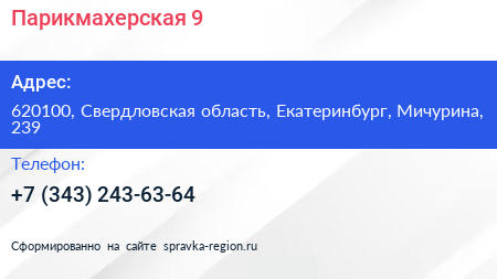 Парикмахерская №9 по адресу 620100, Свердловская область, Екатеринбург, Мичурина, 239 в дальнейшем Организация, размещена в следующих категориях: