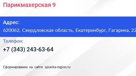 Парикмахерская №9 по адресу 620062, Свердловская область, Екатеринбург, Гагарина, 22 в дальнейшем Организация, размещена в следующих категориях: