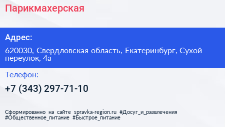 Парикмахерская по адресу 620030, Свердловская область, Екатеринбург, Сухой переулок, 4а в дальнейшем Организация, размещена в следующих категориях: