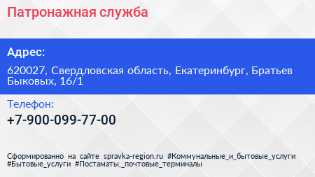 Патронажная служба по адресу 620027, Свердловская область, Екатеринбург, Братьев Быковых, 16/1 в дальнейшем Организация, размещена в следующих категориях: