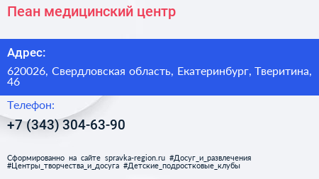 Пеан, медицинский центр по адресу 620026, Свердловская область, Екатеринбург, Тверитина, 46 в дальнейшем Организация, размещена в следующих категориях:
