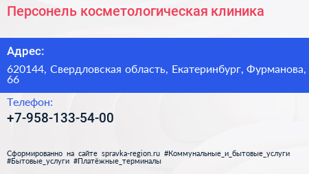 Персонель, косметологическая клиника по адресу 620144, Свердловская область, Екатеринбург, Фурманова, 66 в дальнейшем Организация, размещена в следующих категориях: