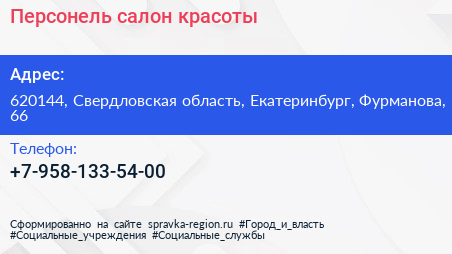 Персонель, салон красоты по адресу 620144, Свердловская область, Екатеринбург, Фурманова, 66 в дальнейшем Организация, размещена в следующих категориях: