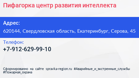 Пифагорка, центр развития интеллекта по адресу 620144, Свердловская область, Екатеринбург, Серова, 45 в дальнейшем Организация, размещена в следующих категориях: