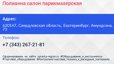 Полианна, салон-парикмахерская по адресу 620147, Свердловская область, Екатеринбург, Амундсена, 73 в дальнейшем Организация, размещена в следующих категориях: