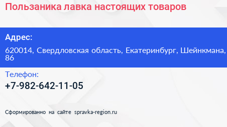 Пользаника, лавка настоящих товаров по адресу 620014, Свердловская область, Екатеринбург, Шейнкмана, 86 в дальнейшем Организация, размещена в следующих категориях: