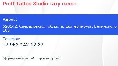 Proff Tattoo Studio, тату-салон по адресу 620142, Свердловская область, Екатеринбург, Белинского, 108 в дальнейшем Организация, размещена в следующих категориях: