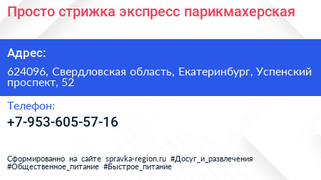 Просто стрижка, экспресс-парикмахерская по адресу 624096, Свердловская область, Екатеринбург, Успенский проспект, 52 в дальнейшем Организация, размещена в следующих категориях: