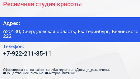 Ресничная, студия красоты по адресу 620130, Свердловская область, Екатеринбург, Белинского, 222 в дальнейшем Организация, размещена в следующих категориях: