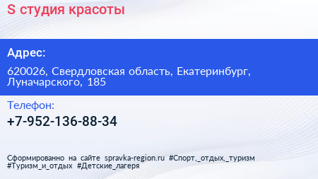 S, студия красоты по адресу 620026, Свердловская область, Екатеринбург, Луначарского, 185 в дальнейшем Организация, размещена в следующих категориях: