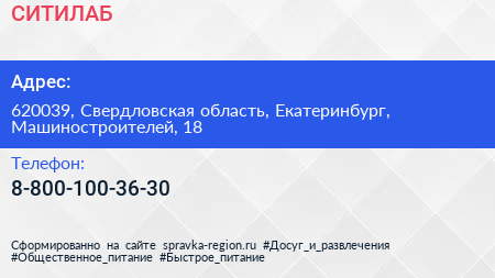СИТИЛАБ по адресу 620039, Свердловская область, Екатеринбург, Машиностроителей, 18 в дальнейшем Организация, размещена в следующих категориях: