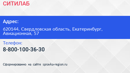 СИТИЛАБ по адресу 620144, Свердловская область, Екатеринбург, Авиационная, 57 в дальнейшем Организация, размещена в следующих категориях: