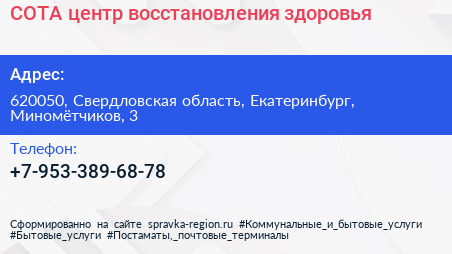 СОТА, центр восстановления здоровья по адресу 620050, Свердловская область, Екатеринбург, Миномётчиков, 3 в дальнейшем Организация, размещена в следующих категориях: