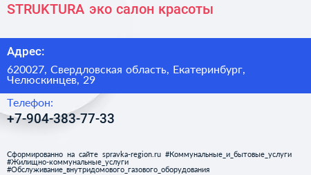 STRUKTURA, эко-салон красоты по адресу 620027, Свердловская область, Екатеринбург, Челюскинцев, 29 в дальнейшем Организация, размещена в следующих категориях: