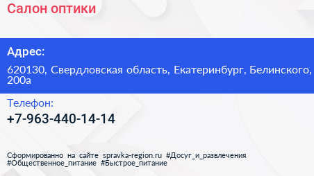 Салон оптики по адресу 620130, Свердловская область, Екатеринбург, Белинского, 200а в дальнейшем Организация, размещена в следующих категориях: