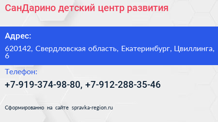 СанДарино, детский центр развития по адресу 620142, Свердловская область, Екатеринбург, Цвиллинга, 6 в дальнейшем Организация, размещена в следующих категориях:
