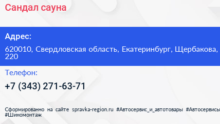 Сандал, сауна по адресу 620010, Свердловская область, Екатеринбург, Щербакова, 220 в дальнейшем Организация, размещена в следующих категориях: