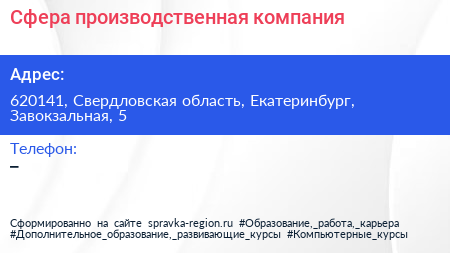 Сфера, производственная компания по адресу 620141, Свердловская область, Екатеринбург, Завокзальная, 5 в дальнейшем Организация, размещена в следующих категориях: