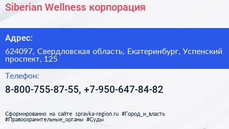 Siberian Wellness, корпорация по адресу 624097, Свердловская область, Екатеринбург, Успенский проспект, 125 в дальнейшем Организация, размещена в следующих категориях: