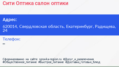 Сити-Оптика, салон оптики по адресу 620014, Свердловская область, Екатеринбург, Радищева, 24 в дальнейшем Организация, размещена в следующих категориях: