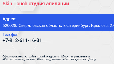 Skin Touch, студия эпиляции по адресу 620028, Свердловская область, Екатеринбург, Крылова, 27 в дальнейшем Организация, размещена в следующих категориях: