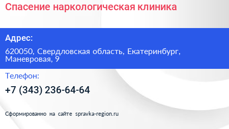 Спасение, наркологическая клиника по адресу 620050, Свердловская область, Екатеринбург, Маневровая, 9 в дальнейшем Организация, размещена в следующих категориях: