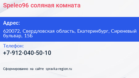 Speleo96, соляная комната по адресу 620072, Свердловская область, Екатеринбург, Сиреневый бульвар, 15Б в дальнейшем Организация, размещена в следующих категориях: