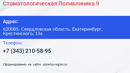 Стоматологическая Поликлиника №9 по адресу 620085, Свердловская область, Екатеринбург, Крестинского, 13а в дальнейшем Организация, размещена в следующих категориях: